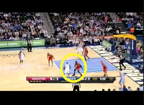 Lawson is able to juke Adrien with a shifty crossover and get past him. No surprise there – Lawson is an NBA point guard.