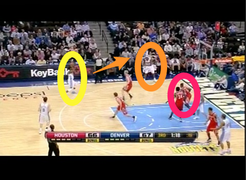 Here, when the ball is swung to the shooter, Adrien is still in the paint, defending his man.