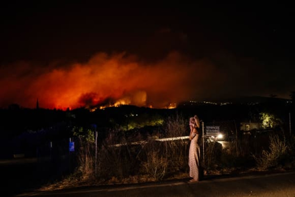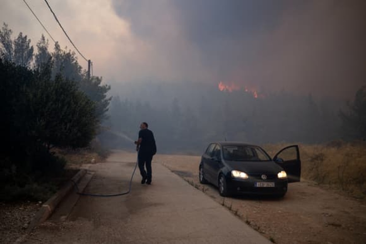 In the eastern Attica province, the town of Varnavas faced a ferocious wildfire on Sunday that quickly spread through the area, forcing the evacuation of hundreds from at least eight neighboring villages. Some residents stayed behind, using makeshift tools to protect their homes from the advancing flames.