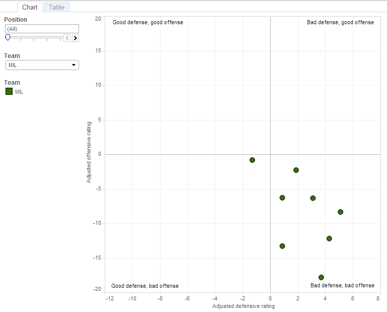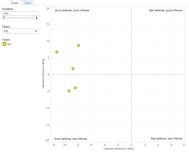 The above chart shows all players’ adjusted defensive ratings on the x-axis and adjusted offensive ratings on the y-axis. Filters on the top left allow you to filter the chart by team and position. A tab on the upper left allows you to switch to a table view, where you can then sort all the players by their adjusted defensive and offensive ratings, and their adjusted net ratings (adjusted offense minus adjusted defense). Remember, for defense, negative numbers are better.