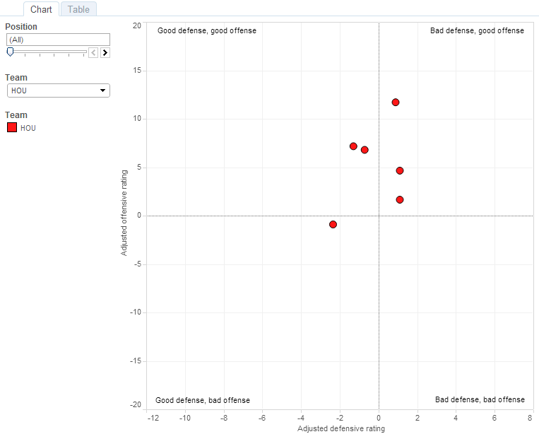 Dwight Howard suddenly looks much less impressive now that his performance has been adjusted. He’s a little above average defensively (though still the best on the team) and is below average offensively. James Harden, on the other hand, is redeemed a bit. He’s one of two players who are above average defensively and offensively, with Terrence Jones being the other. And, no matter how one slices and dices the data, Patrick Beverley’s supposed defensive prowess still does not show up. I’m starting to think that the critics who claim that his defense is more showy than effective are correct. Unfortunately for the PG position, Jeremy Lin is just as bad.